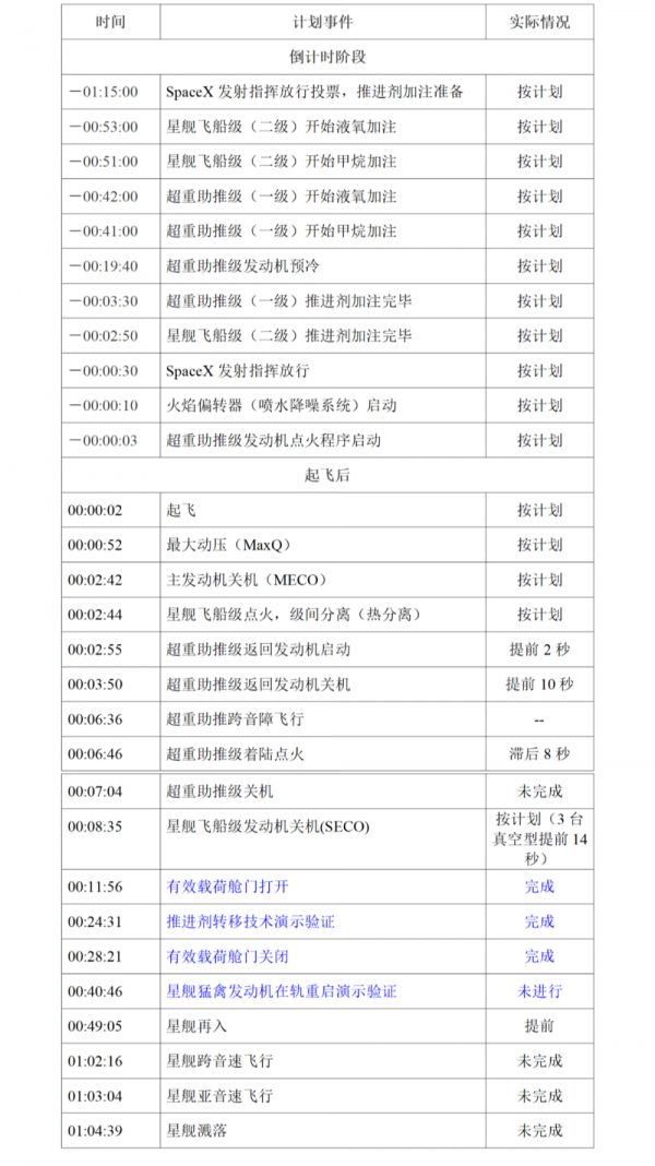 表1 超重-星舰第三次试飞飞行时序及实际飞行情况