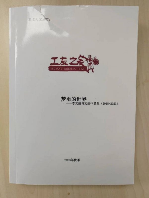 李文丽口中的“文学小组”在北京东五环外的皮村,每周六晚上七点,有高校老师、文学研究者、作家作为志愿者在这里和来自全国各地到北京务工的人员一起讨论文学和艺术作品。李文丽是这里的常客。“文学小组这几年办了几届的‘劳动者文学奖’征文,我还得了一个年度作者奖呢。对了,这个送给你,这里面都是我写的东西,不过没怎么编辑过,有的还有空白页和错别字。”李文丽递给记者一本书,足足有一拳厚,拿在手里沉甸甸的,封皮上写着《梦雨的世界》,梦雨是她给自己取的笔名。这是皮村文学小组的老师和志愿者帮李文丽整理的作品集,里面有诗歌,也有画作。去年11月,李文丽带着它到广州的inD艺术书展上去为文学小组做宣传。“书展上好多人想买,问我多少钱一本,可是这不是正规出版的书,我们都不敢卖。后来问的人太多了,我们想干脆卖几本试试,结果50块钱、80块钱都有人要。”