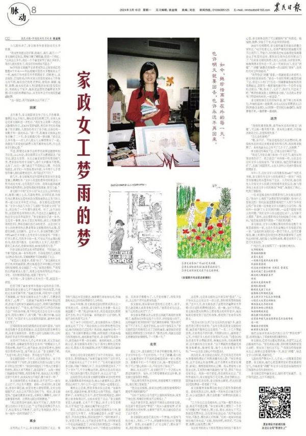 56岁的李文丽离开甘肃老家到北京做家政已经整整8个年头——和这座城市里绝大多数家政女工一样,她的工作内容无外乎照顾孩子、伺候老人、洗衣做饭、打扫房间;但和大家认知里的家政女工形象也有不同,她有自己的笔名梦雨,爱写诗、画画、唱歌、跳舞,她在综艺真人秀《超级演说家》里侃侃而谈、为家政女工发声,她参演法国知名编舞家杰罗姆·贝尔团队的舞蹈作品,在王府井吉祥大戏院里翩翩起舞。