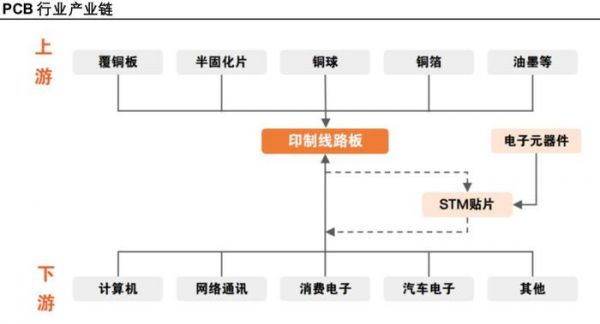 PCB产业链上游主要涉及原材料,如覆铜板、半固化片、铜箔、铜球和油墨等;中游主要是PCB的制造;而下游则是PCB的广泛应用,包括通讯、消费电子、汽车电子、工控、医疗、航空航天等领域,代表性的有华为、浪潮、中兴等。