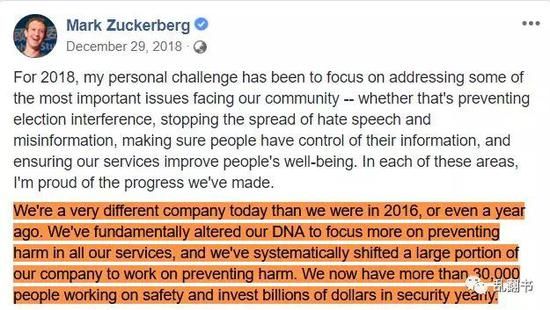 扎克伯格在2018年的最后一条Facebook动态中总结在用户隐私和安全方面的成就,强调”Facebook已经从根本上改变了DNA“: