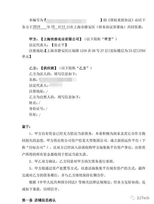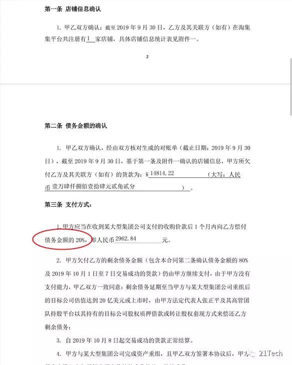 21Tech在淘集集公司采访现场获得的重组协议显示:淘集集在收到重组方支付的收购价款后,一个月内向供应商偿付债务金额的20%,剩余80%的债务,则延期至淘集集与某大型集团公司重组后的目标公司,估值达到20亿美元或上市时偿还。