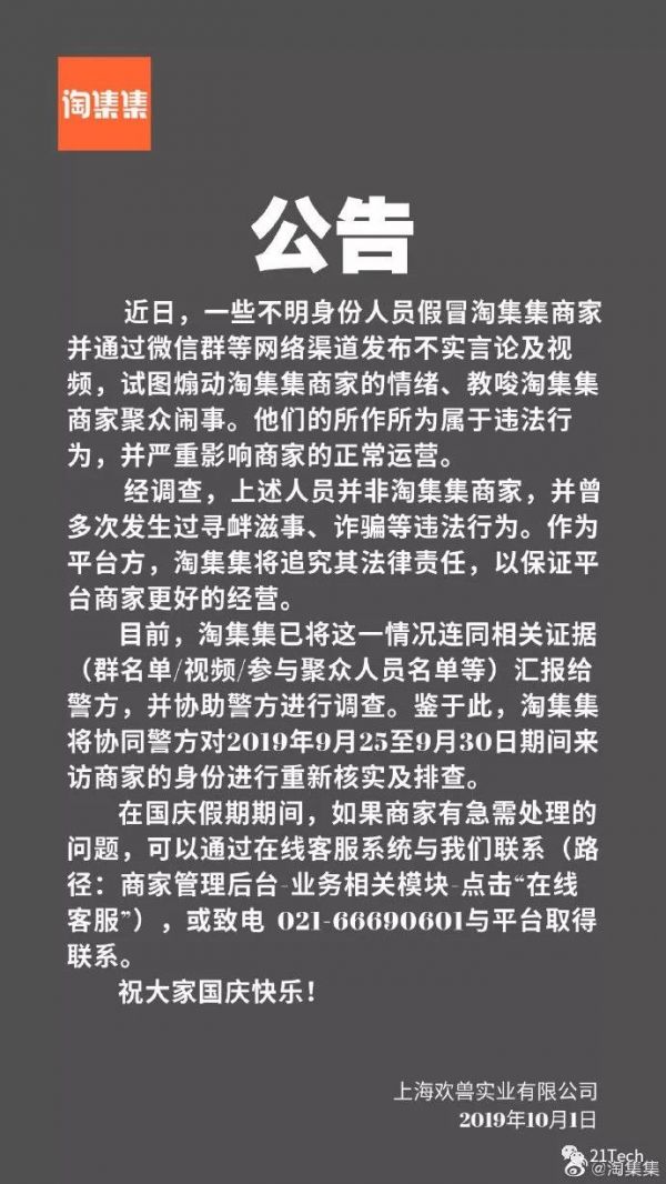 真正的危机爆发在刚刚过去的国庆节,10月1日,淘集集在官方微博发布公告,称近日有不明身份人员假冒淘集集商家并发布不实言论及视频,已将相关情况连同证据汇报给警方以协助调查。