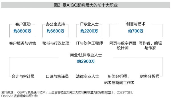 相对于自动化技术替代机械化和重复性任务,AIGC可以涵盖更广泛的任务,包括需要创造性和逻辑推理的工作。这使得更多的职业类型面临被AIGC替代的潜在威胁,而不仅仅局限于体力劳动。根据2023年3月麦肯锡全球研究院研究报告,AIGC对白领造成的影响大于蓝领。其中,受影响最大的前十大职业涵盖客户互动、办公室支持、IT专业人士、创意与艺术、商业/法律专业人士等(见图2)。