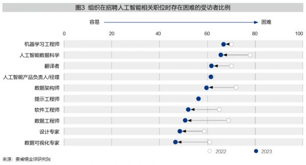 尽管AIGC冲击了很多行业的工作岗位,造成了职业替代,但同时也创造了新的就业机会。麦肯锡最新的人工智能调查数据显示,许多企业正在快速制定AIGC发展和应用战略。自2018年以来,企业对管理、生成式AI人才的需求加速增长,提示词工程师、人工智能训练师等专业性强的职位,更是成为近期招聘的热门。如图3所示,与2022年相比,AI相关人才的招聘难度在2023年有所下降,但相关人才仍然短缺。同时,有7%的受访者称他们的组织在过去一年里雇佣了这些人员。此外,AI也催生出一些普通人能够任职的新职业,如AI作图家、AI叙事员等。