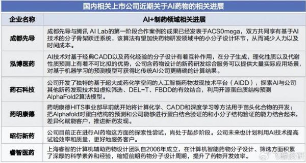 恒瑞医药从一家法国公司引进分子生成人工智能系统;信立泰与深圳阿尔法公司合作开展新药合作;华东医药与晶泰科技签署了管线合作开发协议;复星医药则与英砂智能达成战略合作等,都是和AI技术进行药物研发相关。