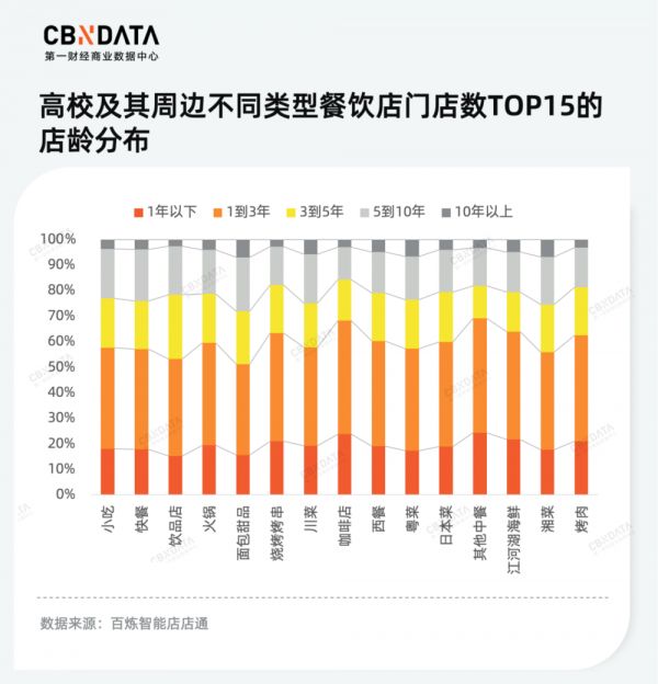 在店铺的经营年限方面,高校区域的商业生态也展现出了与行业整体相符的快速更新换代特征。主要品类的餐饮店中,近20%的门店是在近一年内新开业。对于多数品类而言,三年以下的店铺数量占比约为六成,而经营时间超过十年的“老店”所占比例则不足一成。