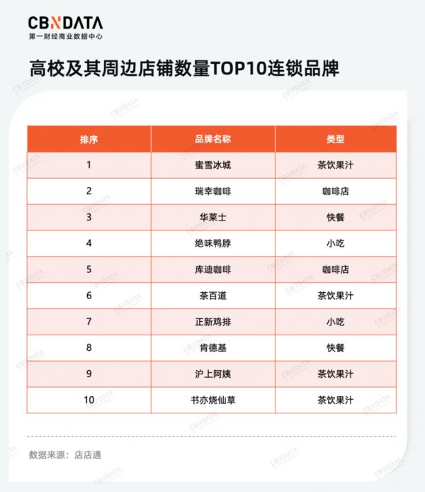 目前,在高校周边的连锁店铺中,咖啡和茶饮果汁这类“轻量级”餐饮占据了较大比例,并且在数量与排名上位居前列。西式快餐是上榜的唯一快餐类型。与此同时,从前几年达到万店规模的正新鸡排、绝味鸭脖、华莱士以及蜜雪冰城,再到去年实现万店的肯德基和瑞幸咖啡,多家万店选手率先逐鹿学校店,学校周边成为万店选手们的必争之地。