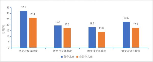 图 1 农村留守儿童和非留守儿童遭受欺凌的比例,数据来源:2022 年中国乡村儿童发展调查
