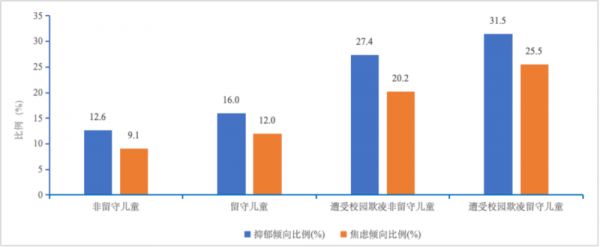 图 2 农村非留守儿童、留守儿童、遭受校园欺凌非留守儿童、遭受校园欺凌留守儿童的心理健康状况,数据来源:2022 年中国乡村儿童发展调查