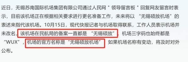 要知道,就在一年前,还一度出现改名“无锡苏州机场”的乌龙,由于不符合机场命名原则,旋即被各方辟谣。