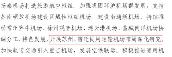 而获得国家批复的江苏省国土空间规划2035,提出开展苏州、宿迁民用运输机场布局深化研究。