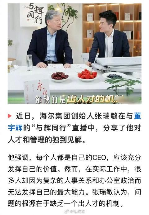 海尔创始人张瑞敏点拨董宇辉:你已经是人才了,挑战是让下面的人也成为人才。
