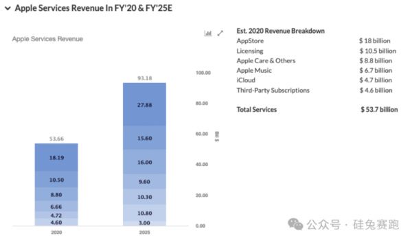 然而对于苹果来说,iCloud不仅未在云计算市场中取得客观的一席之地,其收入贡献也只称得上一般——金融媒体TREFIS对苹果服务类收入的拆分显示,2020年,iCloud的收入仅占8.8%,占苹果总体收入的约1.7%,哪怕是预测到2025年提升至11%,相比Apple Store等其他服务类收入比例仍然较低。