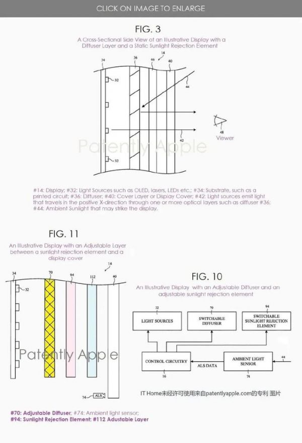 苹果在专利中表示,明亮的环境光可能会降低对比度,冲淡显示内容。为了让屏幕在光线充足情况下提高对比度,苹果在屏幕中内嵌了类似于“百叶窗”的遮光元件,可以是静态的,也可以是动态的(可调节)。