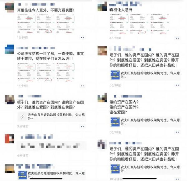 3 月 14 日,农夫山泉华东某大区销售人员突然集中转发了一篇题为《农夫山泉与娃哈哈股权架构对比,令人意外 ~》的文章,该文称娃哈哈集团参与投资的实体运营公司大部分是境外公司或宗氏家族为大股东持股 51%。