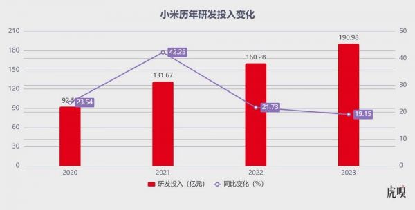 在各项核心业务稳定发展的基础上,小米也有了向新业务倾斜资源的底气。财报显示,2023年全年小米的研发费用为191亿元人民币,同比增幅19.2%。