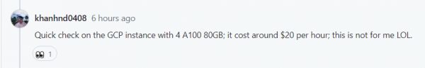 在Grok的GitHub讨论区有用户留言表示:谷歌云上80GB A100的4卡服务器每小时运行成本是20美元,这不适合我。(GCP instance with 4 A100 80GB; it cost around $20 per hour; this is not for me LOL.)
