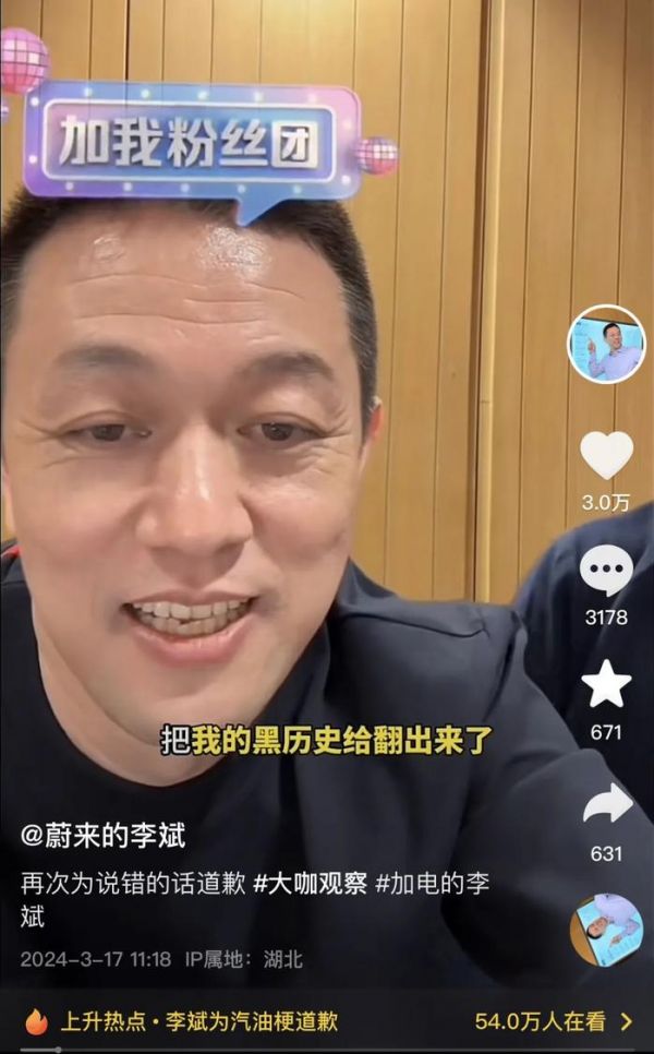 在直播中,李斌对于自己的“油车梗”频频致歉,称自己不应该这么说,当时纯属于聊天聊开心了所以说错话。
