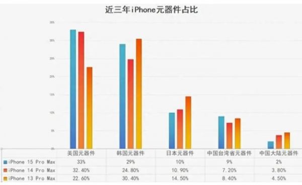 根据第三方机构的数据显示,苹果从iPhone 13系列到iPhone 15系列,中国大陆元器件的占比,在短短两年内就从4.5%急剧下降至2%,呈现出持续不断的下滑趋势。