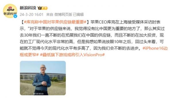 但最搞笑的莫过于库克一再强调中国对苹果供应链最重要,在3月20日现身上海的活动中,库克又再次强调了中国供应链的重要性。