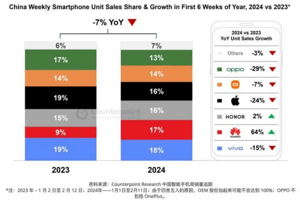 与之相对应的,是华为的销量大涨了64%,这一数据反映了苹果在中国市场上所面临的严峻挑战。