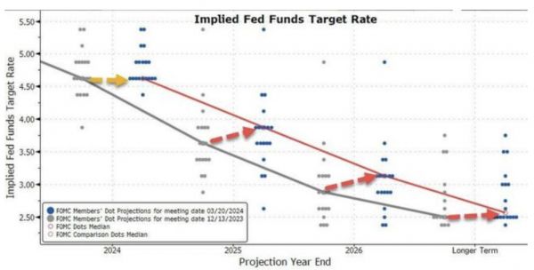 以最新的中位值预测水平估算,美联储官员预计,到今年年底利率均值达到4.65%时,今年内会降息75个基点,相当于共有三次25个基点的降息,和去年12月的预测完全相同。而明后年利率预期的上调相当于,少了整一次或将近一次25个基点的降息,美联储预计届时的降息次数降至不足一次。