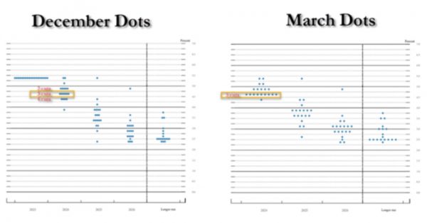 点阵图显示,相比去年12月发布的点阵图,本次美联储官员对今年降息次数的预测更加集中为三次。在提供利率预测的19名联储官员中,共有15人预计今年利率会降至5.0%以下,较上次如此预测的人数少一人。
