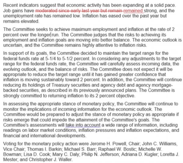 “在考虑对联邦基金利率目标范围的任何调整时,(FOMC)委员会都将仔细评估未来的数据、不断变化的前景和风险平衡。委员会预计,在对通胀持续向2%迈进更有信心以前,不适合降低(利率)目标范围。”