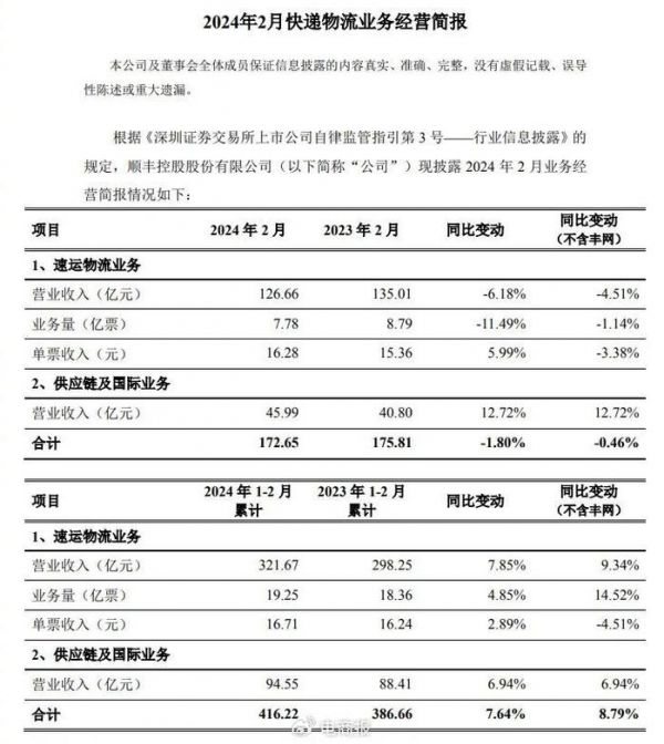 近日,顺丰、韵达、申通、圆通四家快递企业发布了2月经营数据。具体来看,顺丰控股2月速运物流业务、供应链及国际业务合计收入为172.65亿元。其中,速运物流业务营业收入126.66亿元,同比下降6.18%;完成业务量7.78亿票,同比下降11.49%;单票收入16.28元,同比增长5.99%。