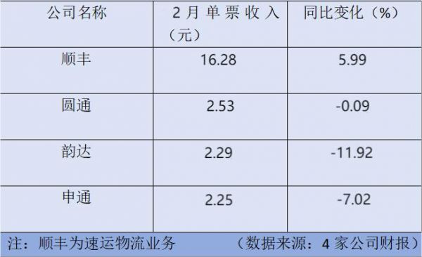 从单票收入来看,除顺丰外,申通、圆通、韵达2月单票收入均有所下降,其中韵达下降的幅度最大。市场人士分析,这或许意味着行业“价格战”有进一步延续的趋势。