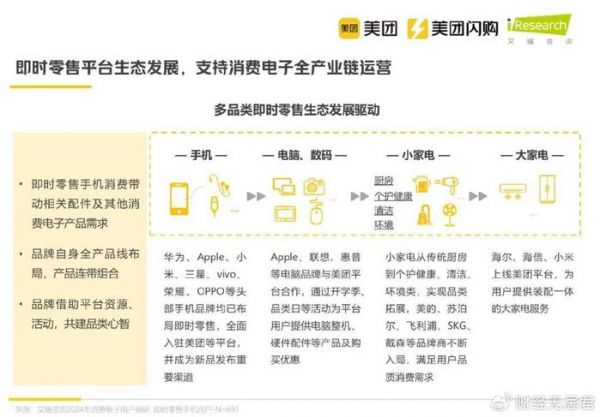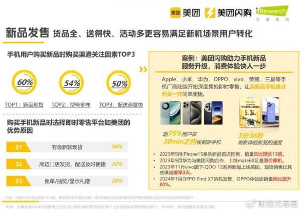 2022年3月,小米与美团闪购达成合作,当时,小米集团合伙人,中国区、国际部总裁,Redmi品牌总经理卢伟冰兴奋地宣布:“ 让米粉像点外卖一样买小米产品”;2022年11月,在发布年度旗舰新品X90系列时,vivo体验店与美团闪购正式合作;去年9月,华为与美团闪购达成战略合作。此外,荣耀、三星、Apple等头部品牌也早已与美团闪购有合作。