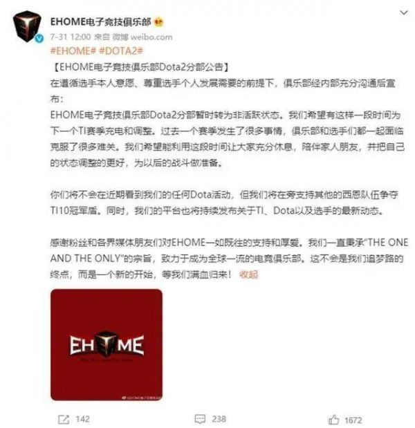 2021年TI11结束后,HEOME俱乐部DPC中国联赛S级名额转卖给了第三方。第三方因假赛,致使EHOME俱乐部被移出DPC中国联赛。当年7月末,HEOME俱乐部发布微博称,DOTA2分部将转为非活跃状态。当年与LGD携手打造“爹妈大战”辉煌的EHOME此后再无音讯。