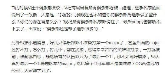 这主要源于其游戏开发商Valve的干预。此前,有著名刀塔博主海涛爆料,称TI时V社召开了俱乐部会议,G胖(Valve创始人)在会议上当着各位老板和选手的面把俱乐部痛批一顿。