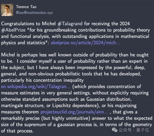 阿贝尔奖委员会主席,对塔拉格兰的获奖很激动,直言:他在概率论方面的工作成果,是“一个惊人的成就”。