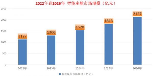 数据显示2022年,中国智能座舱市场规模为1127亿元。预计2026年中国智能座舱市场空间可达2127亿元,五年复合年增长率约为17%。