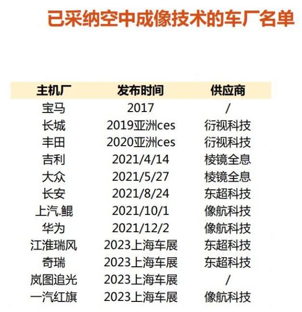 而宝马、丰田、大众、吉利、长城、上汽、一汽也早在2021年先后采用了空气成像的技术,可见各大厂商对这种颠覆性的黑科技的接受度很高。