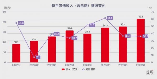 一是,电商业务规模持续扩张,内循环广告保持强劲增长。虎嗅获悉, 2023 年快手针对内循环广告推出诸多优化策略,包括:重度捆绑电商、引导广告投放商家与电商共建、从流量售卖视角切换到商家经营视角(即站在商家经营视角优化广告投放,并交付投后数据)。