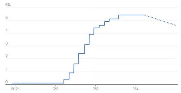 目前联邦基金利率目标区间为5.25%~5.50%。