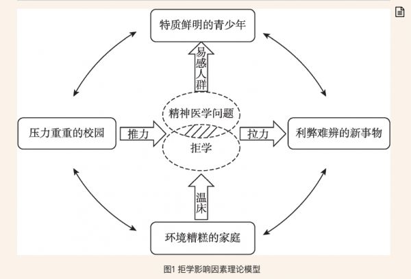 他们绘制了一个拒学的影响因素模型。该模型认为拒学行为背后,是一整套推力和拉力的共同作用:压力重重的校园(如课业繁重、人际霸凌)、环境糟糕的家庭(如情绪暴力、情感忽视)、外部对其利弊难辨的新事物(如电竞、偶像练习生选拔)和青少年易感特质(如抑郁、完美主义、对评价的高敏感性)。