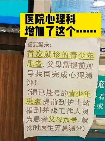 去年,某医院心理科墙上张贴“首次就诊的青少年患者,父母需提前加号共同完成心理测评”的告示在互联网上引发广泛共鸣。