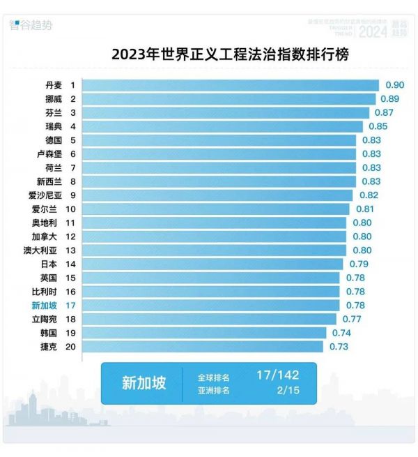 更不用说,新加坡法治环境在全世界都颇具盛名,在世界正义工程公布《2023年法治指数》中,新加坡排名17名,位列亚洲第二。