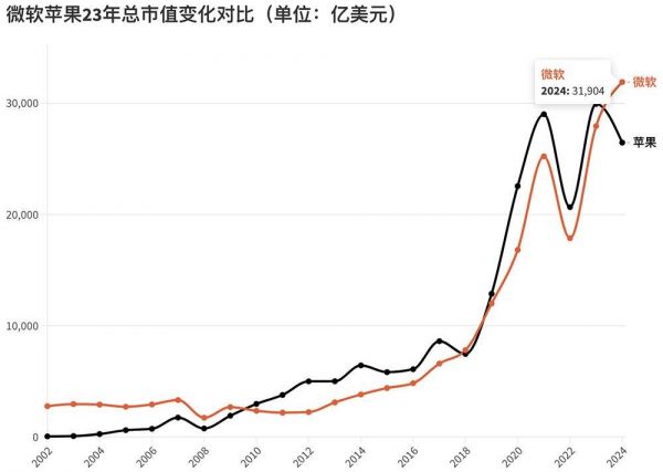 ▲2002~2024年苹果与微软市值变化对比(图源:智东西)