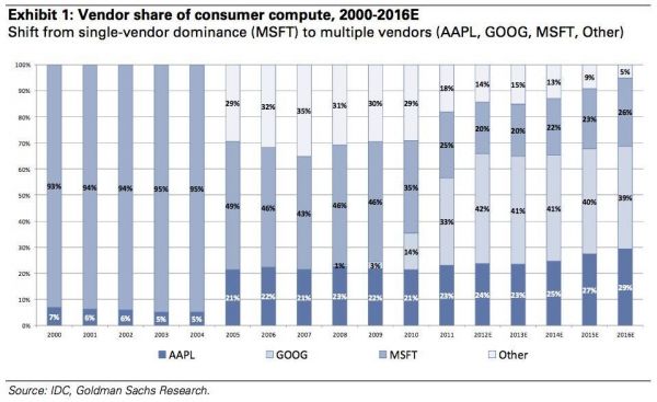 ▲2000-2016年消费者计算机供应商份额(图源:高盛)