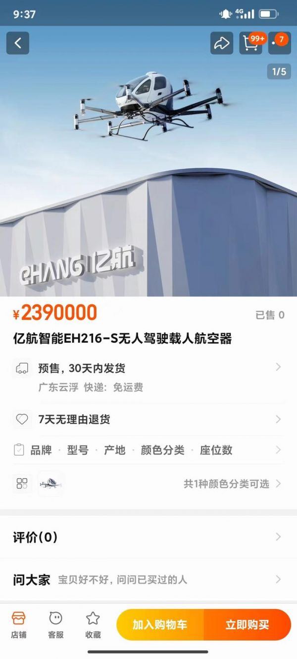 飞行汽车公司亿航智能在淘宝建立了「亿航智能企业店铺」,并上架了无人驾驶载人航空器EH216-S,售价2390000元。「最常用的软件」遇上「最遥不可及的汽车」的结果可想而知,这款无人驾驶的飞行汽车直至现在销量仍为0。店铺内还有一款标价「7个9」的VT-30长行距无人驾驶电动垂直起降航空器。