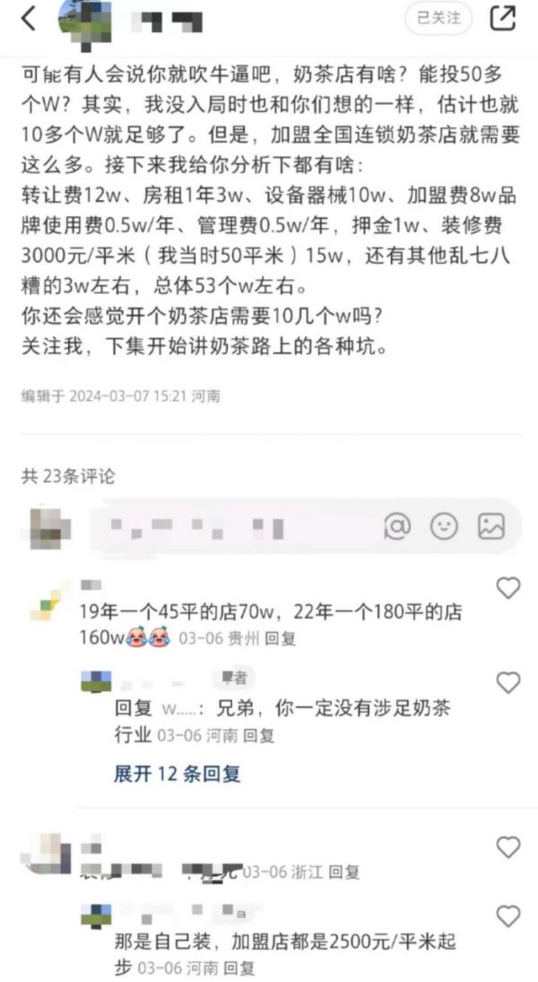 在河南新乡开店的加盟商贾先生曾在小红书上分享过:自己在这个三线城市的大学商业街开了一家奶茶店,花了53万,其中包括了转让费12万,房租一年3万,设备器械10万,加盟费8万以及品牌使用费、管理费、押金、装修费等等。经营了十个月,因洪水和疫情倒闭,亏损30多万。