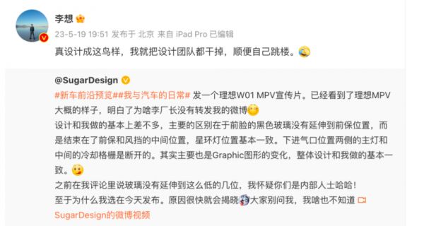 2023年月5日,微博博主SugarDesign发布视频,展示了理想汽车第一款MPV的渲染图,但很快引来了网友的差评,大家纷纷表示太丑。就连李想自己都看不下去了,特意转发微博表示:如果真的设计成这个样子,就把设计部门开除然后自己跳楼。