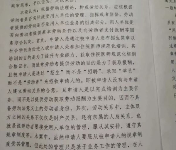 邹雪娇看过一份判决书,显示某三线城市的一位规培生因劳动争议将医院告上法庭。判决书明确表示,规培的目的是为提升专业能力,并非为获取报酬;同时,规培生是通过“招生”而不是“招聘”,医院录取的“学员”而不是“劳动者”。也就是说,医院和规培生之间并不具备法理上的劳动关系。
