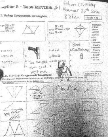 枪击发生当天早上,伊桑的父母克伦布利夫妇就被叫到学校,讨论儿子写下的文字。辅导员拿出伊桑的数学作业纸,枪、子弹的图画清晰呈现,“救救我”“到处都是血”等文字四处散落,令人不安。辅导员对父母说,建议他们立即将儿子带出学校接受心理健康治疗。二人只冷淡地表示自己很忙。“我们得去工作了。”母亲说。