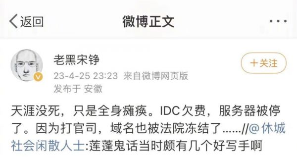 2023年4月,有用户发现,天涯社区的网站和APP已无法正常访问。前天涯社区执行总编宋铮在微博透露,“天涯没死,只是全身瘫痪。IDC欠费,服务器被停了。因为打官司,域名也被法院冻结了。”